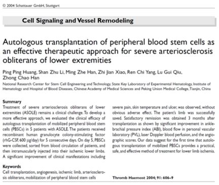 早在2004年和2007年,在首席科学家韩忠朝院士的带领下,汉氏联合研发团队在“外周血管病”领域的国际权威杂志《Thromb Haemost》发表2篇临床研究论文,报道了自体干细胞对重度下肢动脉硬化闭塞症的治疗作用。