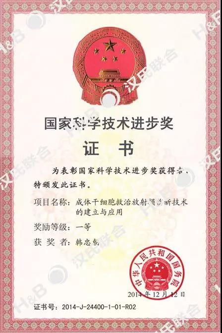 这些成果大大促进了造血干细胞移植技术的进步,为救治放射性损伤提供了有效的解决途径。鉴于韩忠朝院士对这一成果做出突出贡献,获得国家科技进步一等奖。