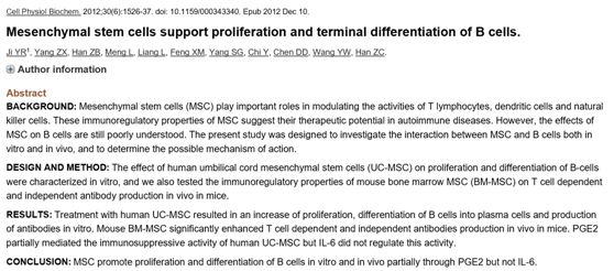 汉氏联合研发团队发表的脐带间充质干细胞促进B细胞增殖和分化的论文
