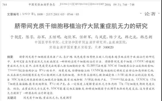 汉氏联合研究团队发现,间充质干细胞对重症肌无力具有显著的治疗作用。 ![]() 汉氏联合研发团队发表的脐带间充质干细胞治疗重症肌无力的论文