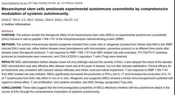 汉氏联合团队还发现,间充质干细胞对眼部的自身免疫性疾病-自身免疫性葡萄膜炎,也具有治疗作用。
