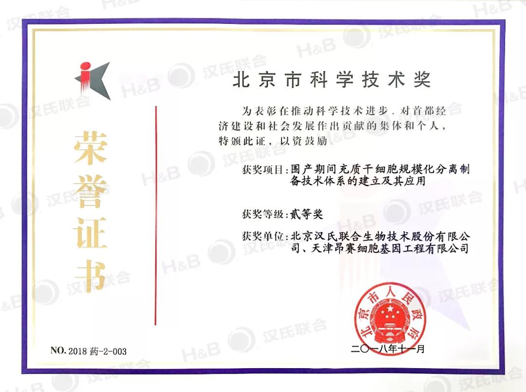 | 汉氏联合开创的干细胞制备工艺体系荣获2018年北京市科学技术发明奖二等奖,这是2018年北京市唯一获奖的干细胞产业化科技项目。
