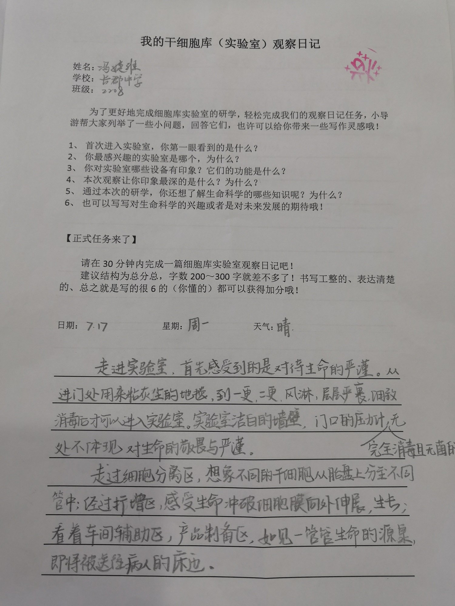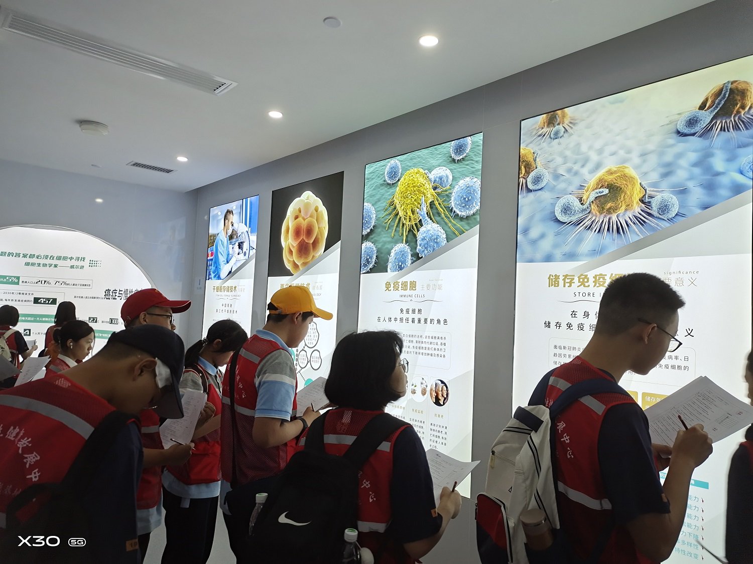 当天,研学体验团通过参观干细胞实验室,配合工作人员的解说,深入了解了干细胞的制备流程,见证干细胞神奇的生物力量,启发大家关于干细胞对于生命及健康的思考。参观完毕,大家将自己对干细胞的所见所闻记录在观察日记中。随后,研学团来到科技馆进行参观,进一步了解干细胞技术发展历程。在答题闯关环节,学生们更是争先恐后找寻干细胞知识。活动最后环节,研学团进行分组,采用团队分工形式将此次参观体验通过绘画形式表达出来,大家各展其能,纷纷提交了大家共同完成的答卷。