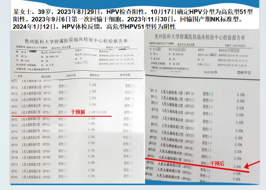 某女士,去年8月体检时发现HPV阳性,属高危型。本人表述,妇科方面也时常不舒服。9月,在咨询了干细胞专家意见后,尝试细胞技术服务进行非治疗性干预。经过两次干预后,今年1月,该女士体检复查,报告显示,高危型HVP病毒已转为阴性。自觉妇科方面的不适也都基本好转。此外,此前患有的多处皮肤疱疹也都愈合了,健康状况得到极大提升。
